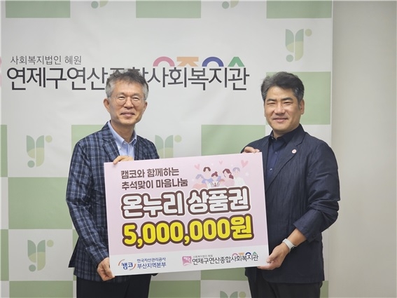 한국자산관리공사(캠코) 부산지역본부가 12일 추석을 앞두고 연제구 연산종합사회복지관을 찾아 후원금으로 온누리상품권 500만원을 전달했다고 밝혔다.
