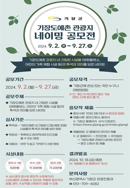 공모전은 오는 27일까지 진행되며, 기장도예촌 관광지의 주요 시설물(부산기장영화촬영소, 안데르센마을 및 동화마을 등)의 공간적 특성과 의미를 반영한 독창적이고 창의적인 명칭을 찾는 것을 내용으로 한다.
