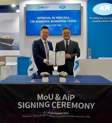 한국선급(KR)이 미국 휴스턴에서 열리고 있는 가스텍 2024에서 HD현대미포가 개발한 '23K 암모니아 벙커링선'과 '18K LNG 벙커링선'에 개념승인(AIP, Approval In Principle)을 수여했다고 밝혔다.
