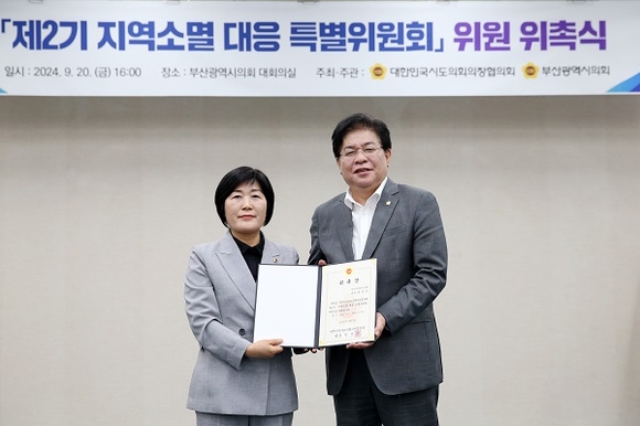 부산시의회가 20일 대회의실에서 대한민국시도의회의장협의회 '제2기 지역소멸 대응 특별위원회' 위원 위촉식과 위원장 선출을 위한 임시회를 개최했다. 이날 임시회에서는 제1기에 이어 부산시 배영숙 의원(부산진구4, 부산시의회 지방시대 특별위원회 위원장)이 제2기 위원장으로 선출됐다.
