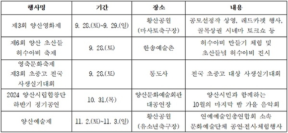 아울러 축제의 계절 가을을 맞아 양산시는 다채로운 문화예술행사로 시민과 관광객 모두가 야외에서 문화체험과 예술공연을 즐기며 행복을 만끽할 수 있는 시간을 마련할 예정이다. 9월부터 11월까지 양산의 여러 장소에서 개최되는 문화예술행사는 다음과 같다.