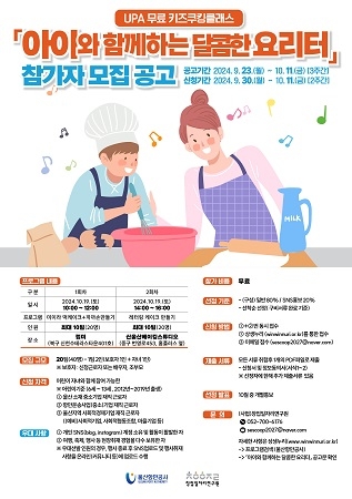 울산항만공사(UPA)는 울산항 협력기업 및 지역 중소기업 근로자 가족을 대상으로 진행되는 쿠킹 클래스 ‘아이와 함께하는 달콤한 요리터’의 참가자를 모집한다고 26일 밝혔다.