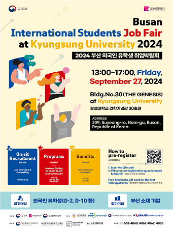 한편 경성대 XR Studio에서는 부산 홍보영상을 상영하며 부대행사로 중소벤처진흥공단의 ‘이력서 및 자기소개서 작성법 특강’과 경성대의 ‘외국인 유학생 취업 선배 특강’이 진행된다.