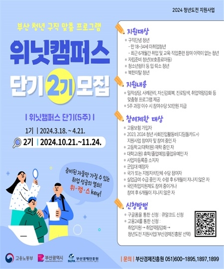 이번 모집은 올해 마지막 하반기 단기 과정(1개월 과정)으로, 총 30명을 선발하며 워크넷 누리집에서 신청 가능하다. 자세한 사항은 부산경제진흥원 일자리지원단 일자리기획팀 또는 위닛상담소로 문의하면 된다.
