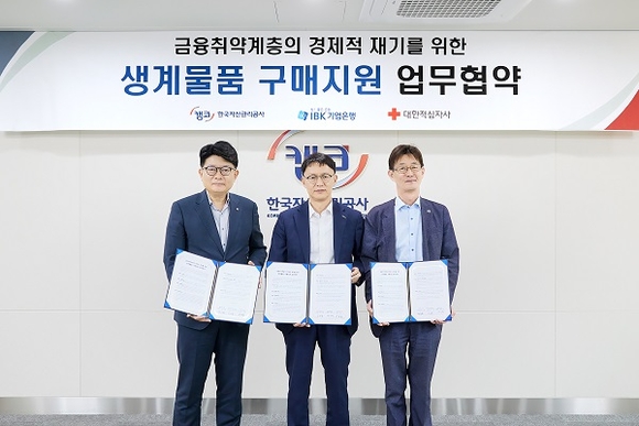 한국자산관리공사(캠코)가 27일 캠코양재타워 17층 대회의실에서 대한적십자사, IBK기업은행과 '금융취약계층의 경제적 재기를 위한 생계물품 구매지원 업무협약'을 체결했다고 밝혔다.