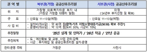 경남도는 지역내 분만산부인과 병원과의 연계, 출생아 수, 접근성 등을 종합적으로 고려해 권역별 공공산후조리원 설치 대상지로 서부권(사천·고성·남해·하동)은 '사천시'로 북부권(거창·산청·함양·합천)은 '거창군'을 선정했다.