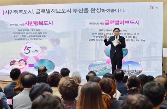 7일 중구청 지하 2층 대회의실에서 개최된 '15분도시 비전투어시즌2 중구 편'에서 박형준 시장이 PT 발표를 하고 있다.(사진=부산시 제공)