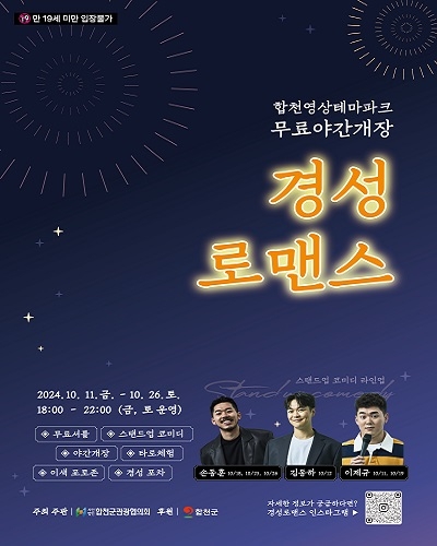 행사를 주최한 (사)합천군관광협의회 이규학 회장은 “영상테마파크의 야간 개장을 통해 관광객을 유치하고, 지역 경제 활성화에 기여할 것”이라며 “맛과 웃음이 함께하는 이번 행사에 많은 관심과 참여를 부탁드린다”고 말했다.