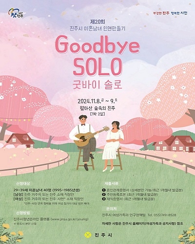 경남 진주시는 결혼 적령기 미혼남녀를 대상으로 소중한 인연을 만날 수 있는 기회를 제공하고 결혼에 대한 긍정적인 인식을 높이기 위해 11월 8일부터 9일까지 월아산 숲속의 진주에서 '제20회 진주시 미혼남녀 인연 만들기 행사 굿바이 SOLO' 행사를 연다고 10일 밝혔다.