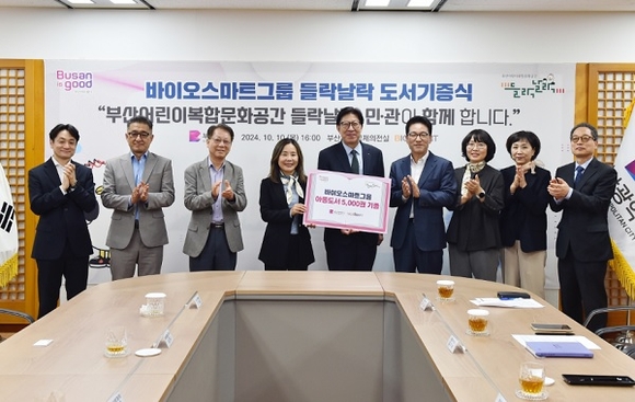 부산시가 10일 시청 국제의전실에서 어린이복합문화공간 '들락날락'에 아동도서 지원을 위한 바이오스마트그룹의 도서 기증식이 개최됐다고 밝혔다.
