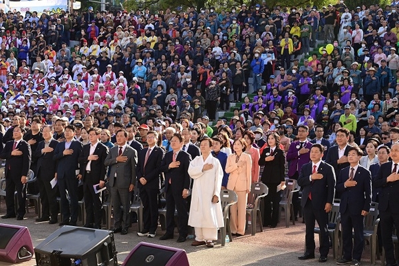 특히 기념식의 마무리를 장식하는 '합동농악놀이' 행사는 30개 전 읍면동의 농악대가 참여해 진주시민 모두가 하나되는 화합의 퍼포먼스로 이날 참석한 시민들의 이목을 집중시키며 즐거움을 선사했다.
