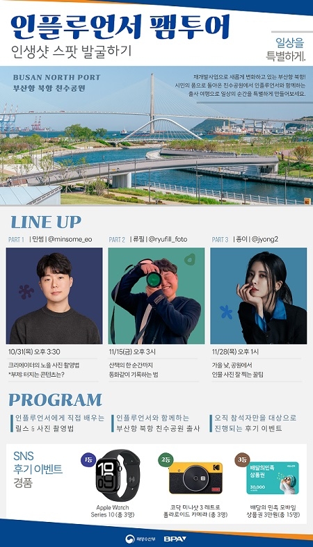 부산항만공사(BPA)가 오는 31일부터 11월 28일까지 총 3회에 걸쳐 부산항 북항재개발사업지 현장을 배경으로 ‘부산항 북항 인플루언서 팸투어 : 인생샷 스폿 발굴하기’ 행사를 개최한다고 밝혔다.