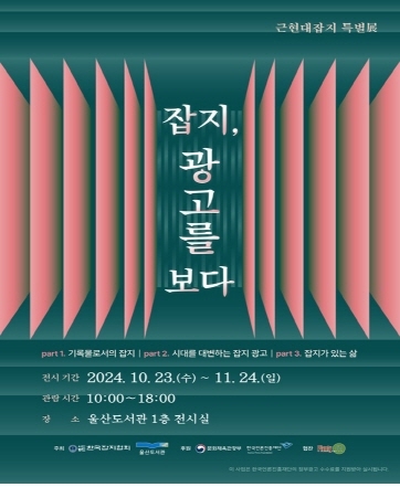 울산도서관은 (사)한국잡지협회와 공동으로 10월 23일부터 11월 24일까지 한 달간 도서관 1층 전시실에서 ‘근현대잡지 특별전(展) - 잡지, 광고를 보다’를 개최한다고 21일 밝혔다.