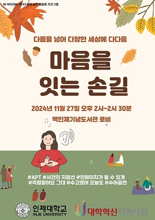 인제대학교는 오는 27일 오후 2시 백인제기념도서관 로비에서 수어 공연 ‘마음을 잇는 손길’을 개최한다고 25일 밝혔다. 이번 행사는 장애인과 비장애인의 소통과 공감을 확대하고 생명 존중의 가치를 실현하기 위해 기획됐다.