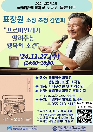 국립창원대학교 도서관은 오는 27일 오후 2시 국립창원대 봉림관 소극장에서 표창원범죄과학연구소 표창원 소장을 초청해 ‘프로파일러가 알려주는 행복의 조건’을 주제로 2024년도 제2회 북콘서트를 개최한다고 26일 밝혔다.