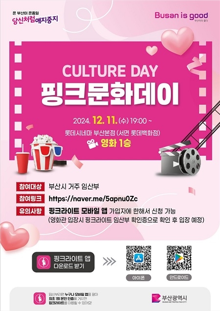 부산시가 임산부를 위한 배려 문화를 확산하고, 임산부 우대업체와 문화사업을 연계하기 위해 오는 12월 11일 ‘핑크문화데이’를 롯데시네마 부산본점에서 개최한다고 밝혔다. 이번 행사는 임산부 100여 가정을 초청해 영화 1승을 관람하는 특별 이벤트로 진행된다.