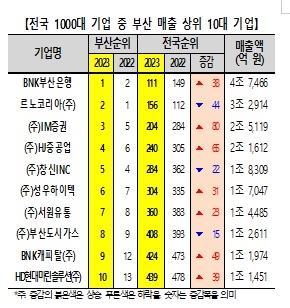 부산의 1000대 기업 중 절반 이상인 19개사가 500위권 밖에 머물러 있으며, 부산 기업들의 전체 매출 증가율은 0.4%에 그쳐 외형적 성장도 미미한 수준이었다.
