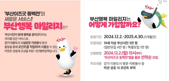 부산시가 오는 12월 2일 오후 3시부터 '부산이즈굿 동백전' 모바일 앱을 통해 '부산행복 마일리지' 시범사업에 참여할 5만 명을 선착순 모집한다고 밝혔다.