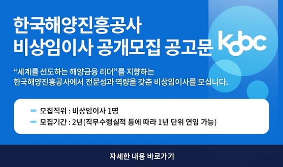 한국해양진흥공사가 28일 공사를 이끌어 갈 임원을 공개 모집한다고 밝혔다. 모집 직위는 비상임이사 1명이며, 공사는 임원 후보자 추천을 위한 임원추천위원회를 구성해 지난 26일 공개모집 계획을 확정했다. 지원서류 제출기간은 11월 28일부터 12월 6일까지이며, 임원추천위원회에서 심사를 거쳐 임원 후보자를 추천하고 임명권자가 최종 임명할 예정이다. 자격요건 등 기타 자세한 사항은 공사 홈페이지에서 확인할 수 있다.