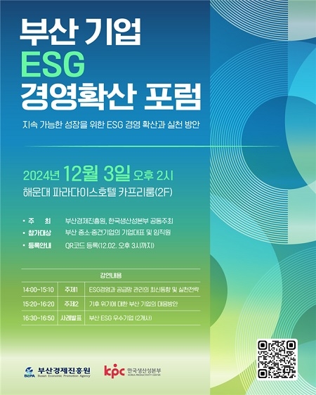 부산경제진흥원이 지역 중소·중견기업들의 지속 가능한 성장을 돕기 위해 '부산기업 ESG 경영확산 포럼'을 오는 12월 3일 부산 해운대 파라다이스호텔 2층 카프리홀에서 개최한다고 밝혔다.