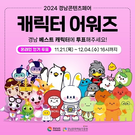 경남을 대표하는 다채로운 캐릭터들이 한자리에 모여 뜨거운 경쟁을 펼친다. 다음 달 7일부터 8일까지 이틀간 창원컨벤션센터에서 개최되는 ‘2024 경남콘텐츠페어’의 ‘캐릭터 어워즈’가 바로 그 무대이다.