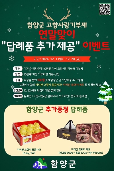 이번 이벤트는 12월 1일부터 20일까지 진행되며, 함양군에 10만 원 이상 기부한 사람 중 추첨을 통해 100명에게 추가 답례품을 증정한다.