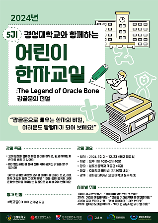 경성대학교는 한국한자연구소 HK+사업단이 주최하는 제5기 어린이 한자교실이 ‘갑골문의 전설’이라는 주제로 다음 달 2일부터 23일까지 분포초등학교 도서관에서 진행된다고 29일 밝혔다.