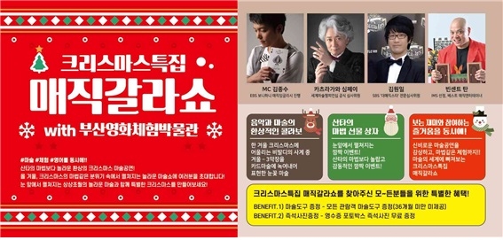 부산시가 부산국제매직페스티벌 조직위원회와 오는 7일부터 15일까지 2주간 매주 토·일요일 부산영화체험박물관 1층 다목적영상홀에서 '크리스마스 특집 매직 갈라쇼'를 개최한다고 밝혔다.