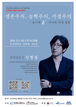 부산대 영화연구소는 2021년부터 포스트 냉전 이후 초연결 시대의 동아시아-네트워크 연구에 대한 개념 인식의 기초적 토대를 마련하기 위해 정기 콜로키움 CINE-NETWORK ON을 꾸준히 진행해 오고 있다. 이번 콜로키움은 신형철 평론가를 초청해 ‘생존주의, 능력주의, 자경주의: 동시대 K-서사의 어떤 경향’을 주제로 강연을 펼친다. 이를 통해 학문적 성과를 지역 사회와 공유하며 지역민의 문화적 소양을 높이는 데 기여하고자 한다.