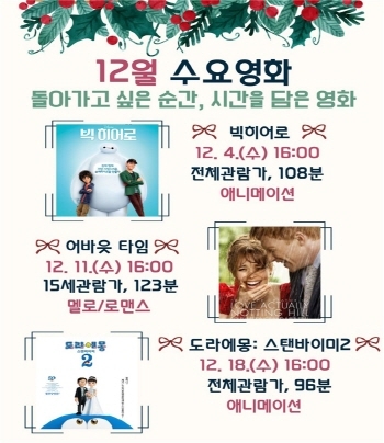 울산도서관 관계자는 “12월 수요영화로 지난 한 해를 돌아보며 지금 여기 존재하기에 잊고 있었던 현재의 소중함을 깨닫고 새로운 시작을 향해 나아가는 힘을 얻을 수 있는 계기가 될 것”이라고 전했다.