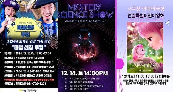 그밖에 14일 정관도서관 ‘미스터리 사이언스 쇼’, 15일 교리도서관 ‘마법선장 루킹’ 등 각 도서관별 특색있는 다채로운 문화공연이 펼쳐질 예정이다.