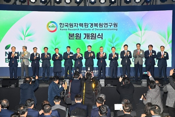 한국원자력환경복원연구원 본원 개원식이 2일 개최된 가운데 이순걸 울주군수와 안효대 울산시 경제부시장, 권병훈 한국원자력환경복원연구원 연구원장, 최남호 산업통상자원부 차관, 황주호 한국수력원자력 사장 등 참석자들이 기념촬영을 하고 있다.(사진=울주군 제공)