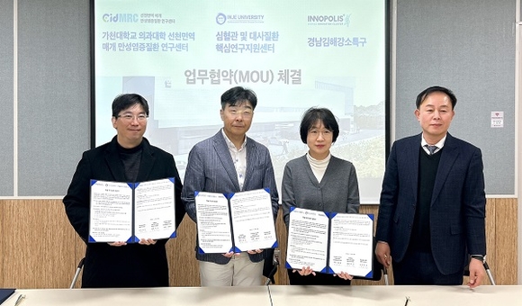 인제대학교 심혈관 및 대사질환 핵심연구지원센터는 지난달 28일 부산백병원 미래의생명센터에서 경남김해강소특구, 가천대학교 선천면역매개 만성염증질환 연구센터, 이길여암당뇨연구원과 학술·연구교류 협력체계 구축을 위한 업무협약을 체결했다고 2일 밝혔다.
