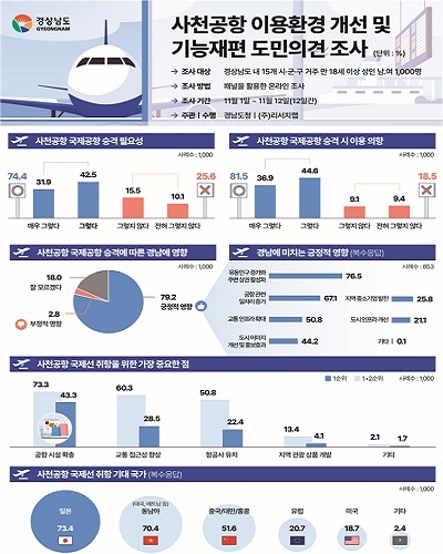 경남도가 사천공항 이용환경 개선 및 국제공항 승격 등 기능재편에 관한 도민의견 수렴 결과를 3일 발표했다.