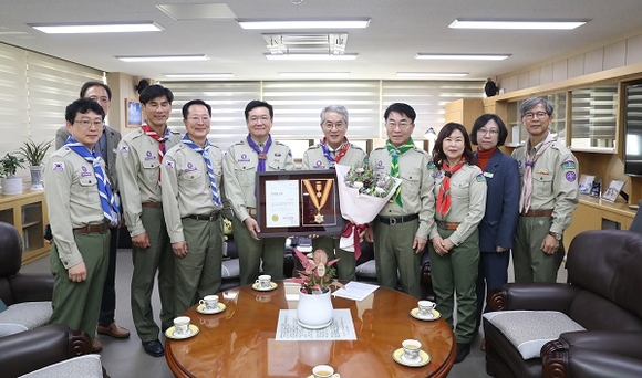 이날 도교육청 교육감 집무실에서 열린 수여식에는 이찬희 한국스카우트연맹 총재, 정영식 경남스카우트연맹 연맹장 등 관계자들이 참석해 자리를 빛냈다.
