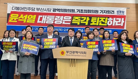 더불어민주당 부산시당 기초의회의원협의회가 윤석열 대통령의 비상계엄 선포를 강도 높게 비판하며 "반헌법적이고 반민주적인 폭거"로 규정, 대통령 탄핵을 강력히 촉구했다.
