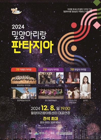 밀양문화관광재단이 오는 8일 오후 7시 밀양아리랑아트센터 대공연장에서 '2024 밀양아리랑 판타지아' 공연을 연다.