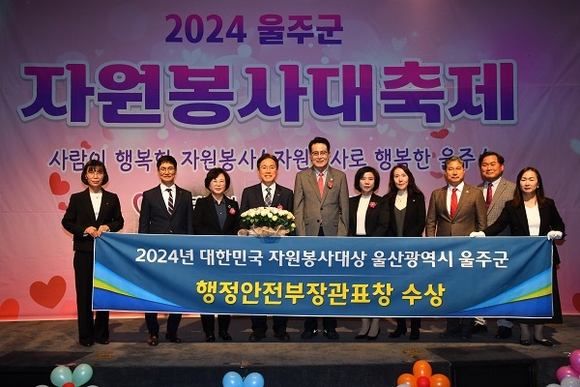 울산시 울주군이 5일 강원도 춘천 한림대학교에서 열린 2024 전국자원봉사자대회에서 ‘2024년 대한민국 자원봉사대상’ 행정안전부장관 기관 표창을 수상했다고 밝혔다.