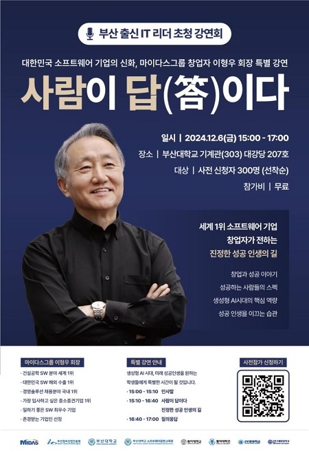 ‘2024 부산 출신 IT 리더 초청 강연회’는 포스터 QR코드 및 `AI배울랑교` 누리집의 구글폼 링크를 통해 참가 신청 할 수 있으며, 300명 선착순 사전 등록으로 진행된다.