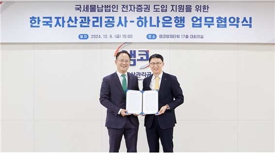 한국자산관리공사(캠코)가 지난 6일 하나은행과 캠코양재타워에서 '국세물납법인 전자증권 도입 지원 업무협약'을 체결했다고 밝혔다.