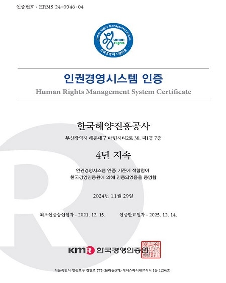 한국해양진흥공사가 인권경영 전문 평가기관인 한국경영인증원(KMR)으로부터 4년 연속 인권경영시스템 인증을 획득했다고 9일 밝혔다.