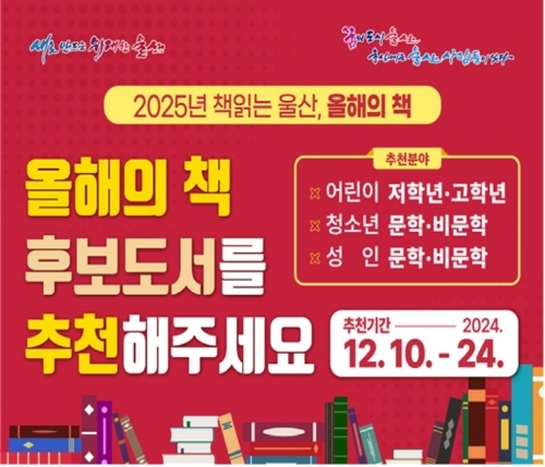 울산도서관 관계자는 “추천해 주시는 책 중에서 2025년도 한 해 동안 울산시민이 함께 읽고, 서로의 생각과 느낌을 공유할 수 있는 ‘올해의 책’이 선정되는 만큼 시민 여러분들의 많은 관심과 참여를 부탁드린다”고 말했다.