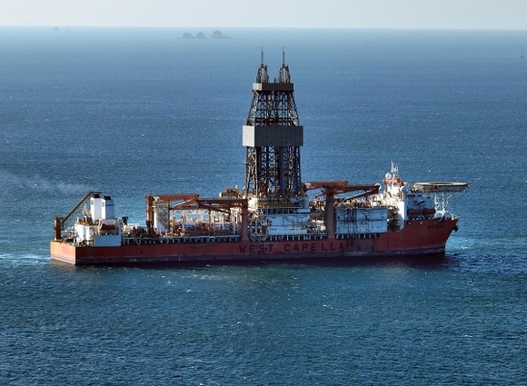 9일 오전 부산항 남외항에 동해 심해 가스전 유망구조에 석유·가스가 묻혀 있는지를 확인할 시추선 '웨스트 카펠라'호가 입항해 있다. 한국석유공사에 따르면 이 선박은 보급기지인 부산신항으로부터 7~8일간 시추에 필요한 자재들을 선적할 계획이다. (사진=석유공사 제공)