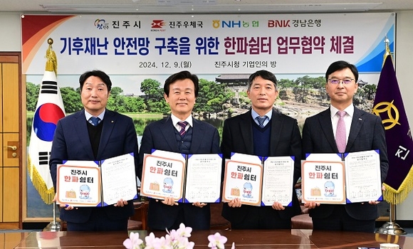 경남 진주시는 9일 진주우체국, NH농협진주시지부, BNK경남은행 서부영업본부와 겨울철 자연재난 안전망 구축을 위한 '한파쉼터' 업무협약을 체결했다.