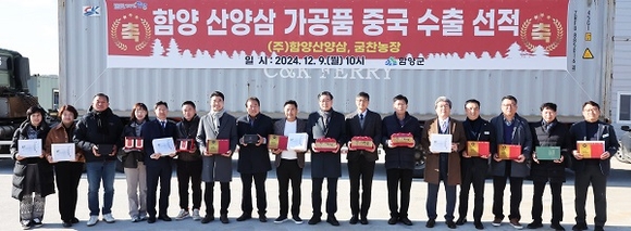 경남 함양군은 9일 ㈜함양산양삼의 산양삼 가공제품 중국 수출을 기념하는 선적식과 함께 산림청 정부 지원 공모사업인 임산물 글로벌 수출특화시설 준공식을 개최했다고 밝혔다.