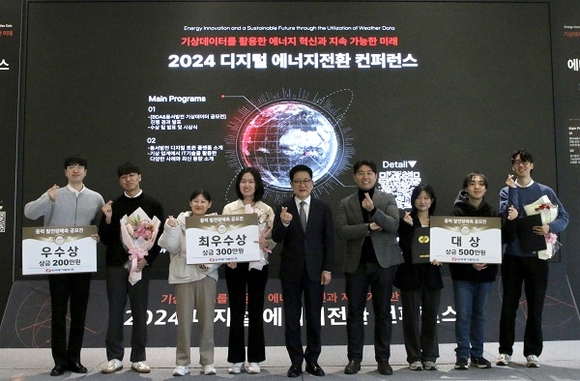 2024 디지털 에너지전환 콘퍼런스 풍력 발전량 예측 공모전 시상식에서 권명호 동서발전 사장과 수상자들이 기념사진을 촬영하고 있다. (사진=동서발전 제공)