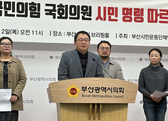 부산 시민운동단체연대가 12일 오전 부산시의회 브리핑룸에서 기자회견을 열고 윤석열 대통령의 비상계엄 선포와 이를 둘러싼 국민의힘 국회의원들의 행태를 강하게 비판하며 책임 있는 행동을 촉구했다.
