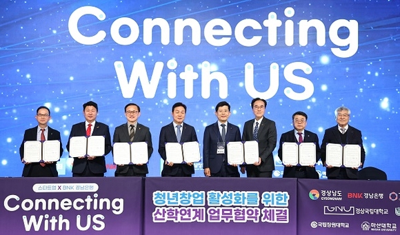경남도는 12일 거제 소노캄 호텔에서 BNK경남은행과 도내 5개 대학(경상국립대, 국립창원대, 경남대, 인제대, 마산대)과 함께 청년과 대학의 창업 활성화를 통한 창업생태계 조성 상호지원 업무협약을 체결했다.