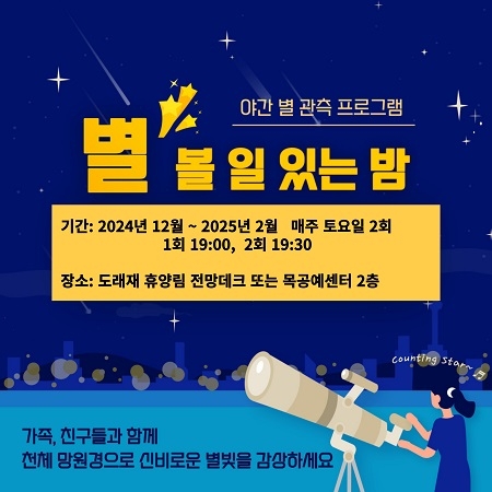 '별 볼 일 있는 밤'은 내년 2월까지 매주 토요일 2회씩 진행된다. 각 회차는 오후 7시와 7시 30분에 각각 시작해 약 20분간 진행된다. 참가 인원은 회차당 20명으로 제한되며, 도래재 자연휴양림 전망 데크 또는 목공예센터 2층에서 열린다.