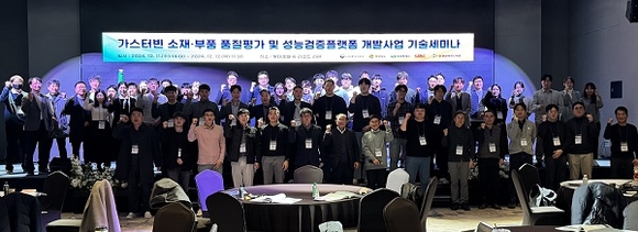 ‘가스터빈 소재·부품 품질평가 및 성능검증플랫폼 개발사업 기술세미나’에 참여한 관계자들이 단체 기념촬영을 하고 있다. (사진=경남TP 제공)
